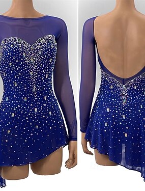 Vestidos para Patinação Artística Mulheres Patinação no Gelo Vestidos Azul Real Patchwork Sem costas Com Stretch Treino Competição Roupa para Patinação Clássico Cristal / Strass Manga Longa Patinação