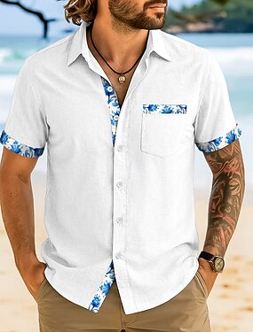 Homens camisa de linho camisa de verão Camisa casual camisa de praia Camisa havaiana Flor / Plantas Férias Havaiana Azul Manga Curta Lapela Primavera Verão Roupa Imprimir