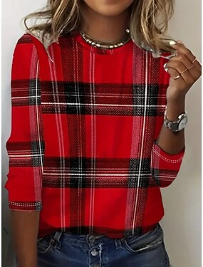 Mulheres Camiseta Gráfico Geométrica Xadrez Vintage Moda à moda Manga Longa Gola Redonda Decote Redondo Tops regulares Diário Final de semana Imprimir Verde Claro Rosa Vinho Verde Tropa Vermelho
