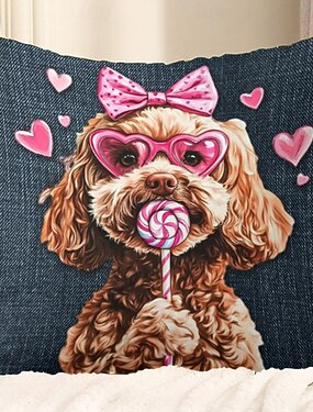Capa de almofada rosa com estampa plana 2D para o Dia dos Namorados, com cervo usando laço, segurando rosas e piscando o olho. Design fofo e decorativo, perfeito para decorar sofás e camas.