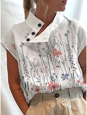 Mulheres Camiseta T-shirt Botões Imprimir Floral Moda à moda Clássico Manga Curta Gola Alta Tops regulares Diário Para Noite Final de semana Rosa Roxo Verão Primavera