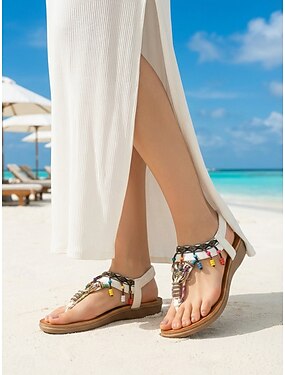 sandálias femininas boho com tiras em T e detalhes em pérolas, sandálias coloridas de tira fina e rasteiras para férias na praia, festivais de verão e roupas casuais