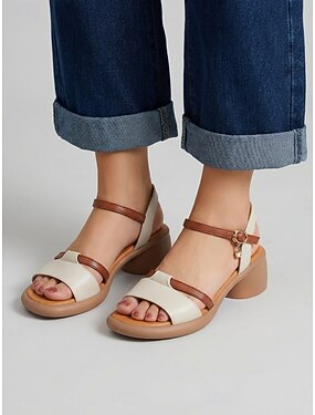 Sandálias femininas bicolor com salto bloco e tira no tornozelo – sandálias confortáveis de bico aberto, leves e com amortecimento, ideais para festas no jardim e viagens. &roupa casual