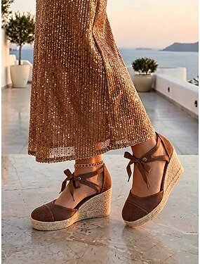 Sandálias espadrille femininas marrons com salto plataforma e laço no tornozelo – perfeitas para férias. &sapatos de noite de resort