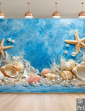 Tapeçaria de parede com conchas e estrelas-do-mar, pérolas e motivos marinhos, ideal para decoração de quartos, salas de estar, dormitórios e outros ambientes.