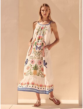Vestido longo de cetim geométrico para o verão, com cintura marcada.