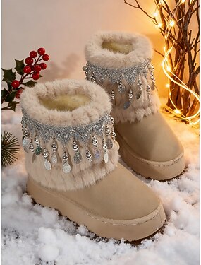 Botas de neve femininas bege em pele sintética com franjas de strass – botinhas de plataforma quentinhas para festas de inverno, Natal e moda de fim de ano.