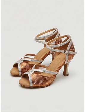 Sapatos de dança latina femininos em tom bege com strass, modelo aberto na frente e com tira no tornozelo, ideais para salsa, tango e dança de salão. & desempenho
