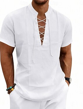Homens Camiseta Camisa Henley Camisa de manga longa Manga Curta Colarinho Clerical Verão Primavera Tecido Vintage Moda Roupa de rua Com Cordão Diário Férias Desportos e Ar livre Cinzento Escuro Preto