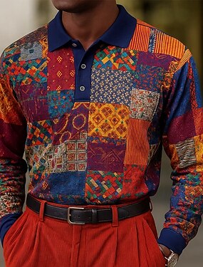 Homens Abstrato Geométrico Pólo Manga Longa Camisas polo Lapela Business casual Roupa Esportiva Roupa Diária Impressão 3D Botões Primavera Outono Inverno Vermelho Arco-íris