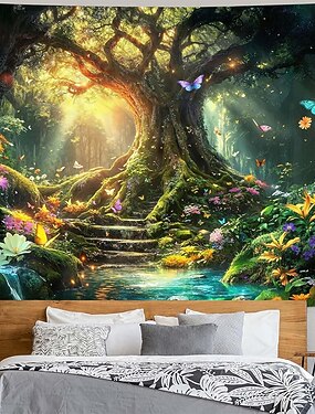 Tapeçaria de parede com árvore da vida em uma floresta mágica encantada, com borboletas, flores, caminho de pedra, luz solar e cachoeira. Arte fantástica para decoração de quarto e sala de estar.