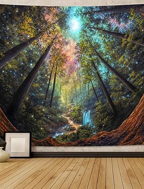 Tapeçaria de floresta encantada, arte de parede fantástica com paisagem natural vibrante para decoração de quarto e sala de estar, criando uma atmosfera aconchegante e mágica.