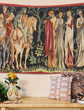 Tapeçaria de parede medieval estilo William Morris com cavaleiros e damas, movimento pré-rafaelita de artes e ofícios, cena de floresta, grande, para sala de estar, escritório ou decoração de casa.