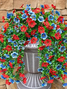 Arranjo de flores artificiais para pendurar em áreas externas, comemorativo do 4 de julho, com 6 peças de plantas artificiais de seda para o Dia da Independência, flores vermelhas, brancas e azuis