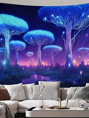 tapeçaria de parede bioluminescente com floresta mágica, árvores gigantes azuis brilhantes e céu noturno, cenário psicodélico de cogumelos neon na selva para sala de jogos, quarto, dormitório,