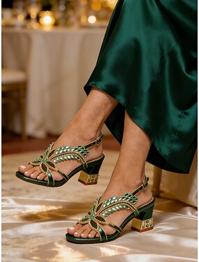 Sandálias femininas de salto alto verde esmeralda com aplicações, elegantes sapatos de bico aberto para mães que comparecem a um casamento na cidade.