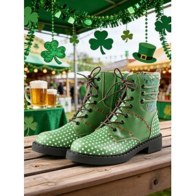 Botas femininas de cano curto com cadarço e estampa de bolinhas verdes - botas casuais de couro com estampa decorativa e zíper lateral, ideais para as festas do Dia de São Patrício, passeios no mercado, encontros casuais e tarefas do dia a dia.