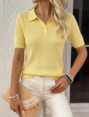 Mulheres Topo de ilhó camiseta de tricô Moda à moda Casual Manga Curta Colarinho polo Tops regulares Diário Para Noite Azul Branco Amarelo Verão Primavera