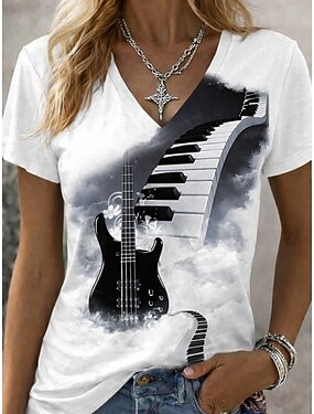 Mulheres Camiseta Imprimir Floral Gráfico Música Vintage à moda Clássico Manga Curta Decote V Tops regulares Diário Esportes Para Noite Branco Roxo Verão Primavera Outono Inverno