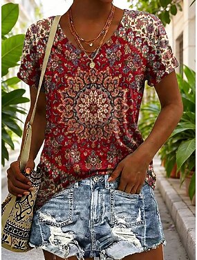 Mulheres Camiseta Imprimir Gráfico Geométrica Vintage à moda Clássico Manga Curta Decote V Tops longos Diário Vermelho Roxo Verão Primavera
