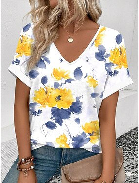 Mulheres Camiseta Imprimir Floral Gráfico Vintage à moda Clássico Manga Curta Decote V Tops regulares Diário Final de semana Roupas de férias Azul Amarelo Roxo Verde Verão Primavera