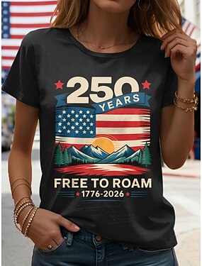 Dia da Independência Americana Mulheres Camiseta Imprimir Gráfico Letra Bandeira americana à moda Clássico Casual Manga Curta Gola Redonda Tops regulares Diário Preto Verão Primavera