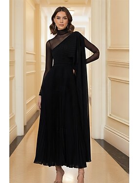 Linha A Longo Vestidos de noite Vestido de Baile Vestido formal Elegante Brilhante Sedoso Manga Longa Gola Alta Casamento Formal Chiffon com Pregas