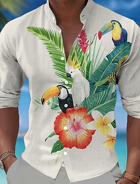 Homens Flores tropicais Folha de palmeira tucanos Camisa Social Camisas havaianas Camisa de gola alta Manga Longa Havaiana Casual Férias Primavera Outono Colarinho Mandarim Faixa Impressão 3D Camisas