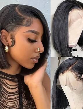 Cabelo humano remy 13x4 Lace Front Peruca Prumo Bob curto Parte livre Cabelo Brasileiro Liso Preta Peruca 150% Densidade do Cabelo com o cabelo do bebê Riscas Naturais Para perucas para mulheres