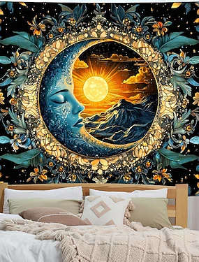Tapeçaria de parede celestial com sol e lua crescente, paisagem montanhosa e noite estrelada, estilo boho místico, para decoração de quarto.