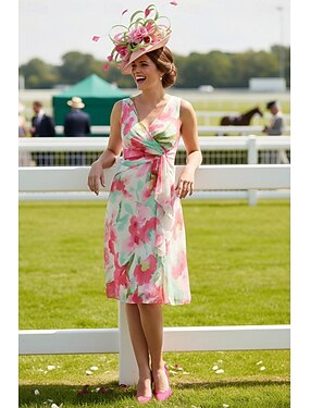 Tubinho Até os Joelhos Vestido de festa Vestido Coquetel Vestido de convidada de casamento Vestidos de baile Elegante Sem Manga Decote V Formal Convidado do casamento Chiffon com Laço(s)