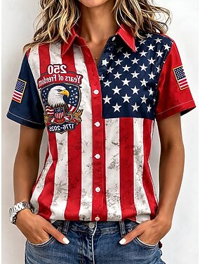 Dia da Independência Americana Mulheres Camisa Social Blusa Patchwork Botões Imprimir Gráfico Bandeira Vintage à moda Casual Manga Longa Colarinho de Camisa Tops regulares Diário Azul Vermelho Verão