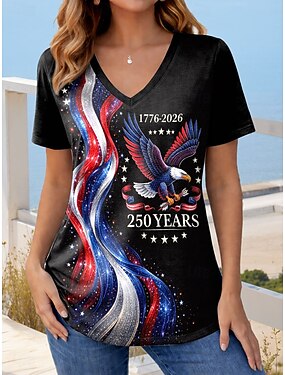 Dia da Independência Americana Mulheres Camiseta Imprimir Gráfico Bandeira à moda Clássico Casual Manga Curta Decote V Tops regulares Diário Amarelo Vermelho Roxo Verão Primavera