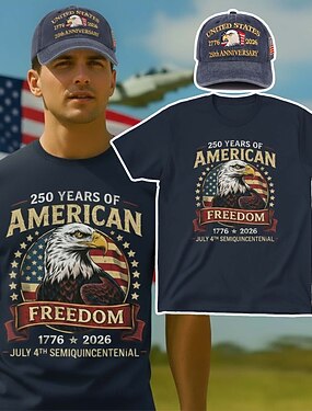 T-shirt e Boné do 250º Aniversário dos EUA - Camiseta Gráfica da Águia da Bandeira dos EUA 1776-2026 Patriótica para Homens Adultos para o Dia da Independência