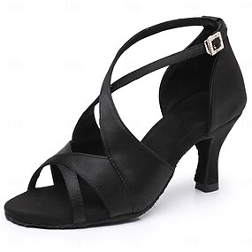 sapatos de dança de salão femininos de cetim preto com tiras cruzadas e bico aberto, saltos perfeitos para dança latina e salsa