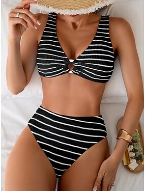 Mulheres Roupa de Banho Biquíni 2 partes Slip roupa de banho Delgado Frente Única Férias Roupa de Praia Listrado Decote V Sem Manga Fatos de banho