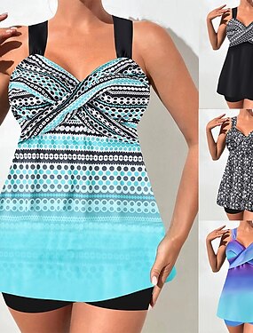 Womens Tankini de 2 peças maiô perna de menino controle de barriga cintura alta sem costas férias roupas de praia listrado geométrico decote halter sem mangas