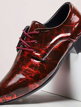 Sapatos Oxford masculinos em verniz marmorizado vermelho e preto, com cadarço, para ocasiões formais, como casamentos, banquetes, festas, formaturas, apresentações de palco e eventos noturnos de alta costura.