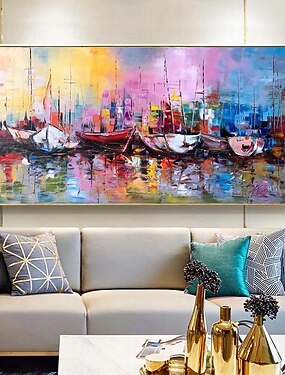 pintado à mão grande veleiro ao pôr do sol pintura a óleo sobre tela longa pintura horizontal arte de parede colorida iate pintura decoração de parede barco à vela paisagem pintura a óleo para sala de