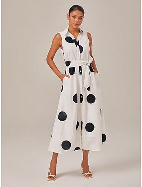 Mulheres Camisetão Bainha Maxi Vestido Longo Branco Sem Manga Poá Bolsos cinto de gravata Verão Lapela Casual Diário S M L
