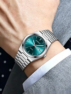 Relógio masculino com mostrador azul, luxuoso relógio de pulso de quartzo bicolor em aço inoxidável com dia e data, relógio analógico com numerais romanos e bisel canelado, relógio elegante e