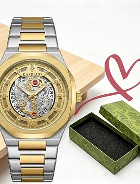 Relógio masculino esqueleto, relógio de pulso de luxo bicolor em aço inoxidável, relógio analógico à prova d'água com caixa de presente, presente elegante para marido, pai e filho, prata e dourado.