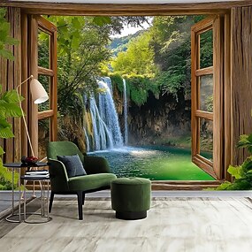 Tapeçaria 3D com vista de janela, paisagem de floresta e rio, árvores verdes e natureza, para pendurar na parede da sala de estar, decoração de casa, arte de parede, pôster de tecido.
