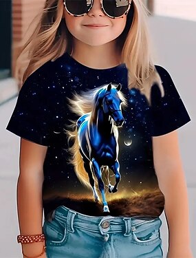 Para Meninas 3D Cavalo Camisa Camiseta Manga Curta Verão Primavera Moda Básico Infantil 4-12 anos Gola Redonda Ao ar livre Casual Diário Normal
