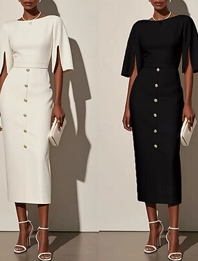 Mulheres Vestido midi Vestido de trabalho Vestido da bainha Elegante Moda Moderno Escritório Normal Tecido Meia Manga Gola Redonda Preto Branco Primavera Outono