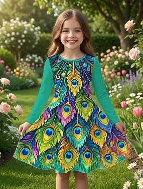 Meninas 3D Gráfico Pavão Vestido Manga Longa Impressão 3D Primavera Outono Diário Férias Festa Casual Princesa Lindo Infantil 4-12 anos Vestido casual Vestido A Line Altura dos Joelhos Normal