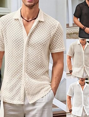 Homens Camisa Social Camisa casual camisa de botão Camisa Jacquard Preto Branco Bege Manga Curta Geométrica Tecido Colarinho de Camisa Casual Diário Vazado Roupa Elegante Moda Casual