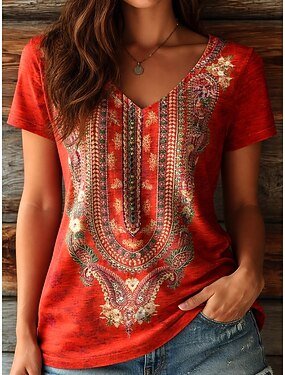 Mulheres Camiseta Bordado Imprimir Gráfico Tribal à moda Clássico Casual Manga Curta Decote V Tops longos Casual Diário Vermelho Roxo Verde Bege Verão Primavera
