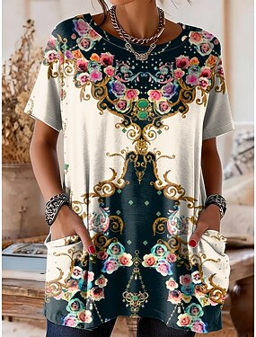 Mulheres Camiseta Imprimir Floral Gráfico Vintage à moda Clássico Manga Curta Gola Redonda Tops regulares Casual Diário Final de semana Azul Roxo Verde Bege Verão Primavera