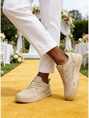 Tênis casual masculino bege para casamento – calçado leve, respirável e confortável para casamentos ao ar livre, recepções e uso no verão.